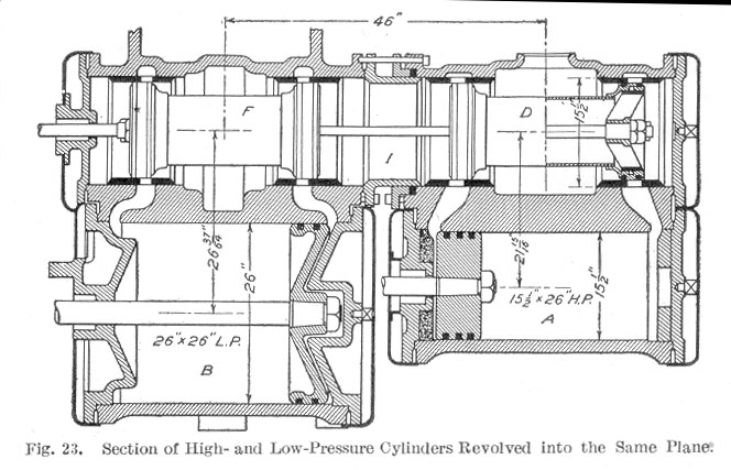 The high- and low-pressure cylinders, A and B, are shown in Fig. 23 as they would appear in section revolved into the same plane. The high-pressure valve D is arranged for central admission and the low-pressure valve F for central exhaust, both valves being hollow. A thimble casting or round joint ring and a gland connect the two parts of the continuous valve chamber I.