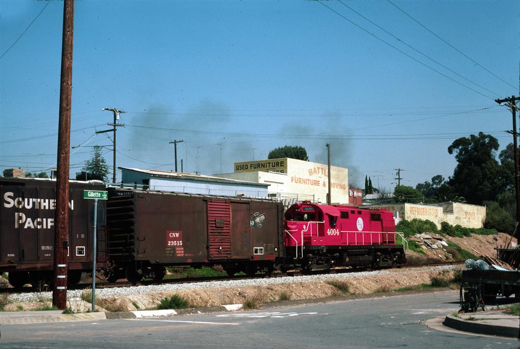 The SP RS-32's saw extensive service between San Francisco and Los Angeles hauling Coast Merchandise trains. They were eventually demoted to switcher service and scattered all over the system. SP sold all ten of its RS-32's in 1978 and 1979. Chrome Crankshaft bought most of them, including ours, and sent them off in lease service in solid red paint retaining the SP numbers. 4004 went to San Diego's SD&AE to work the freight over the SD Trolley line and was photographed many times by local railfans on its way to El Cajon.